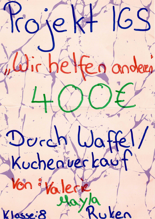 Valerie, Mayla und Ruken nahmen durch Waffel- und Kuchenverkauf Spenden in Höhe von 400 € ein. Ein toller Erlös, den sie mit Recht stolz persönlich in der Tafel abgegeben haben.